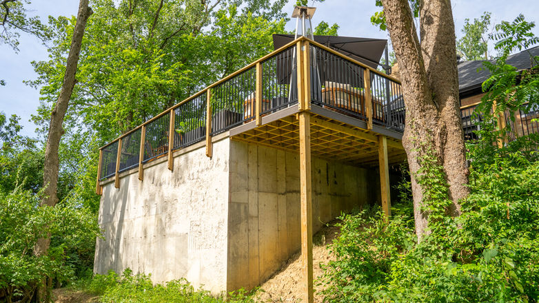 The owners had a beautiful lush property with heavy trees lining a stream near the back of their backdoor. They did extensive remodeling inside, and wanted to have the pool off the kitchen on the top floor so they could go out and have coffee by it in the morning. Three other hardscape design firms had come by for consultation and said it couldn't be done. With the stream so close and the soft ground, it would be impossible. According to the homeowner, Landfare Ltd came in confidently and outlined how to reinforce the pool structurally immediately.
